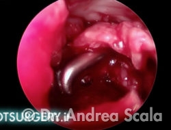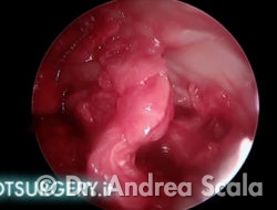 La telecamera è stata introdotta all’interno della regione calcaneale. Dal lato opposto penetra la sonda che consente di esaminare le strutture da curare. Nel caso particolare si vedono i residui della voluminosa borsite retrocalcaneale che deve essere asportata. La parte malata viene rimossa mediante strumenti motorizzati ed eliminata mediante l’aspiratore.