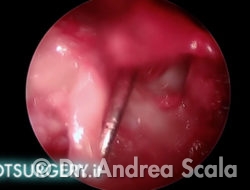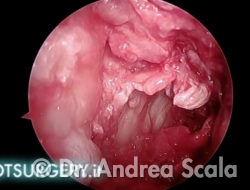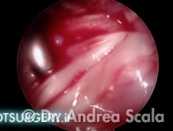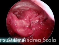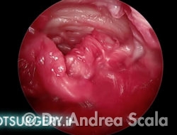 L’asportazione della sporgenza calcaneare crea una cavità in prossimità della inserzione del tendine d’achille. La telecamera ruota verso il “soffitto” della cavità per esaminare il tendine d’achille. I residui della borsa infiammata aderiscono alle fibre del tendine.