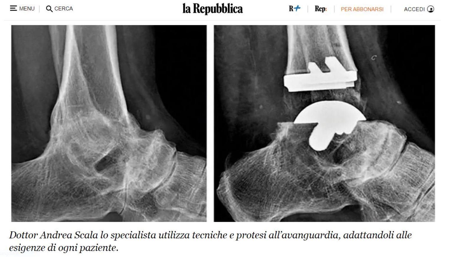 Inoltre, nel 1998, il Dottor Scala ha impiantato per primo la protesi di Caviglia a Roma, un’operazione che permette di riprendere tutte le normali attività quotidiane, sport compreso.