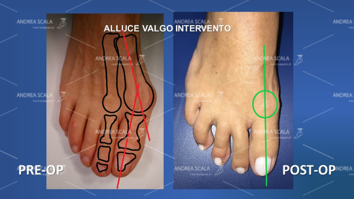 Nella immagine si vede l’alluce valgo prima dell’intervento e il risultato dell’intervento. In particolare si vede l’ angolo intermetatarsale patologico e la successiva correzione dell’ angolo intermetatarsale dell’alluce valgo.