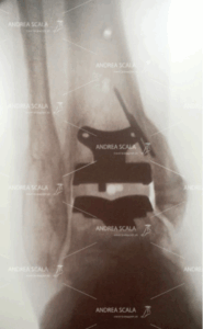La RXgrafia intra operatoria mostra la visione laterale di un congegno applicato all’asta di allineamento esterna della tibia. Si tratta di un blocchetto di plastica trasparente all’interno del quale sono state montati dei reperi metallici, visibili alla RXgrafia intra operatoria. La genialità di questo congegno è che mostra in anticipo come sarà la protesi di caviglia: