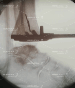 La RXgrafia intra-operatoria mostra la visione laterale del sistema di allineamento della protesi di caviglia, applicato all’esterno all’osso della gamba del paziente. Applicato all’asta di guida si vede una lunga barra sovrapposta alla tibia. Si vede anche una sottile linea metallica perpendicolare all’asta longitudinale, che aiuta ad impiantare la protesi perpendicolare all’asse longitudinale della gamba.