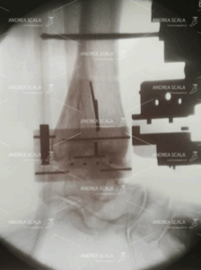 La RXgrafia intra operatoria mostra la visione anteriore dell’apparato di misurazione esterno all’osso della gamba. Il grande apparato deve essere allineato all’asse longitudinale della gamba. La sottile linea metallica assicura che la protesi avrà un andamento parallelo al suolo e che sarà perpendicolare all’asse longitudinale della gamba.
