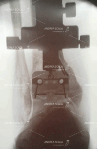 La RXgrafia intra operatoria mostra la visione laterale di un congegno applicato all’asta di allineamento esterna della tibia. Si tratta di un blocchetto di plastica trasparente all’interno del quale sono state montati dei reperi metallici, visibili alla RXgrafia intra operatoria. La genialità di questo congegno è che mostra in anticipo come sarà la protesi di caviglia:
