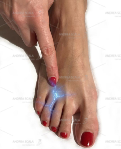 Ciò che sente il paziente affetto da Neuroma di Morton, quando appoggia il piede suolo, sono una serie di scosse tra le dite che diventano sempre più dolorose e persistenti fino a impedire i movimenti. Il nervo, infatti, a causa di questa patologia è ingrossato dall’ infiammazione e viene schiacciato tra le teste dei due metatarsi facendo scaturire quella che le persone identificano come una scossa, dovuta allo schiacciamento dei nervi dell’avampiede.