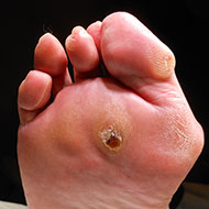 La pianta del piede mostra un callo sotto la testa del 2° metatarso. La paziente toglie questo callo ogni 15 giorni, ma si riforma subito per cui deve essere tolto contemporaneamente all’alluce valgo.