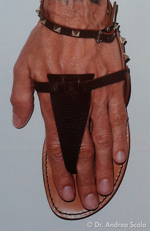 Questa foto curiosa spiega molto bene l’origine dell’alluce valgo. Nella mano il metacarpo ed il pollice sono divaricati: proprio questa divaricazione è la caratteristica della specie umana (pollice opponente). Il piede non deve avere questa divaricazione. Semplice, no?