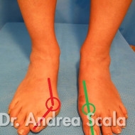 Nella foto si vede un alluce valgo deformato (ROSSO) e un alluce operato tre anni fa con la tecnica del dott. Scala (VERDE). L’immagine mostra l’allineamento delle ossa del piede. L’alluce è bello dritto e non si sposta più.