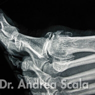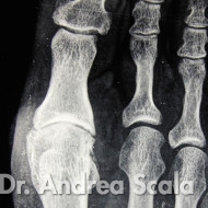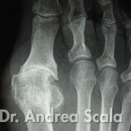 IMG 5 – La radiografia mostra la scomparsa dello spazio articolare e la deviazione dell’alluce che non è in asse.