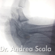IMG 7 – La radiografia mostra la gravità dell’alluce rigido. Si capisce che l’alluce non si muove perché urta contro lo “sperone” dorsale del 1° metatarso.
