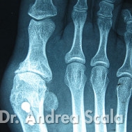 IMG 6 – La radiografia mostra lo sperone osseo che si forma sul 1° metatarso e la deviazione verso la pianta dell’alluce. Si capisce che in queste condizioni l’alluce è bloccato e non può andare verso l’alto.