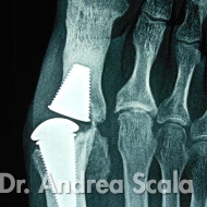 IMG 4 – La radiografia mostra che il tentativo di impiantare una protesi per alluce rigido non ha ottenuto il movimento desiderato. La protesi si è bloccata, le componenti si sono spostate.